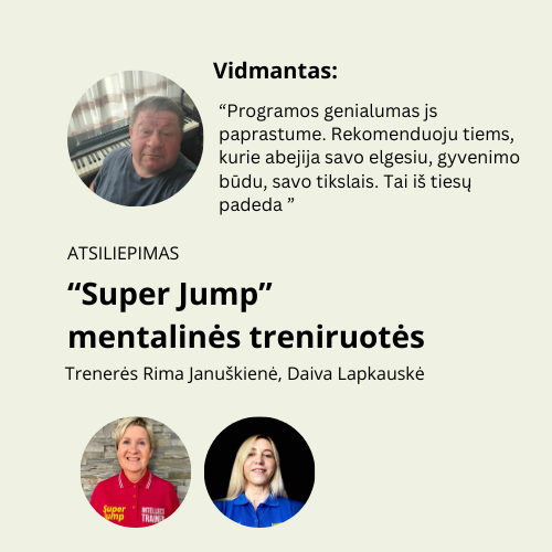SUPER JUMP - tai pasaulyje pripažinta asmenybės ugdymo sistema, kuri padeda siekti sėkmės visose gyvenimo srityse, ugdo skirtingus intelekto tipus. Metodo autorius garsus verslininkas, bestselerių autorius, milijonierius Vladimir Dovgan. Visi treneriai yra nepriklausomi Tarptautinės Super Jump Asociacijos nariai ir veda mokymus visame pasaulyje nuotoliniu būdu. Sveiki atvykę į Daivos Lapkauskės, Rimos Januškienės, Birutės Naruševičienės Super Jump Intellect Klubą