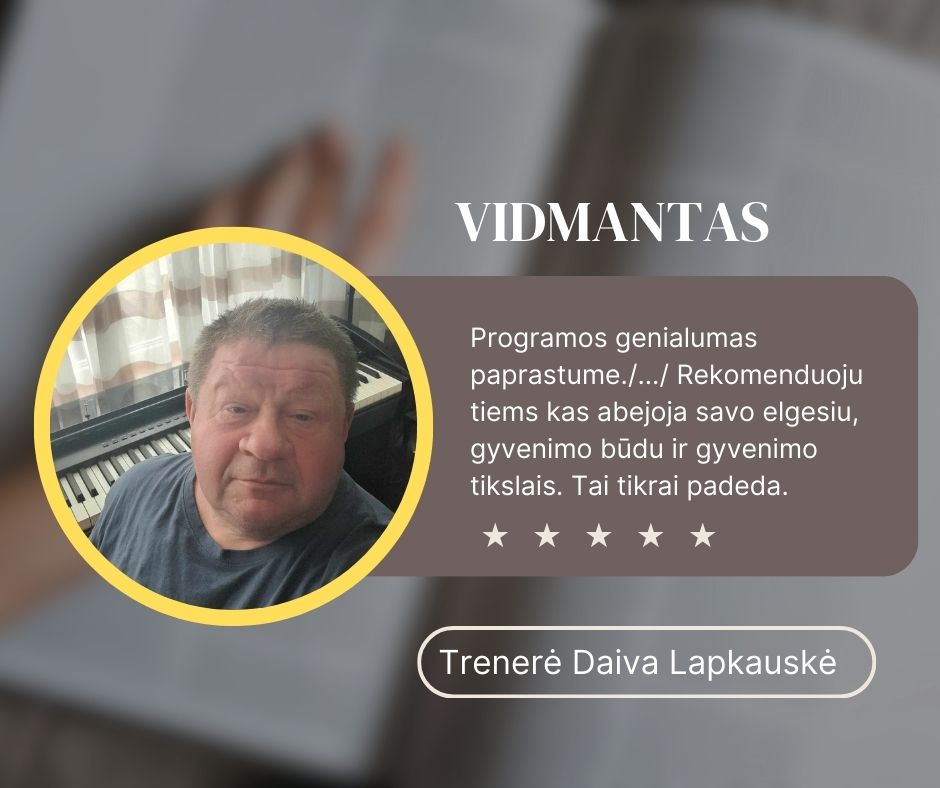 Atsiliepimas toks. Programos genialumas paprastume. Treniruočių pradžioje atrodė, kad viskas aišku ir žinoma. Tačiau praėjus 8 treniruotėms iškilo daugybė minčių ir klausimų. Sekančiame rate pavyko rasti atsakymus į kai kuriuos aktualius klausimus bei atsirado jausmas, kad pasikeitė elgesys, veiksmai ir nusistatymai. Praėjus 1 mėn po treniruočių pastebėjau, kad ne visi įgūdžiai išliko. Vadinasi reikia dar tobulėti. Dėkoju programai ir visiems kartu dirbusiems žmonėms. Rekomenduoju tiems kas abejoja savo elgesiu, gyvenimo būdu ir gyvenimo tikslais. Tai tikrai padeda.