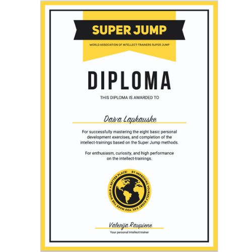 - ☀ Baigiau daug mokymų, webinarų , seminarų programų .......... Supratau, kad žinios be praktikos rezultato neduoda. Žinoti yra viena, o daryti kas kitą. Taikydama Super Jump metodiką praktiškai suvokiau, kad visos asmenybės tobulėjimo žinios susideda į 8 SUPER JUMP pratimus . Atlikdami juos mes kaip architektai formuojame SAVO NAUJĄ ASMENYBĘ.